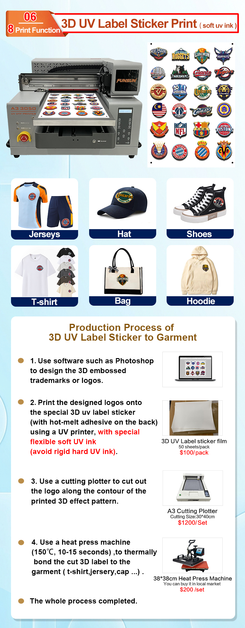 Function 6 : 3D Label Sticker for Jersey,T-shirt(Soft UV Ink)